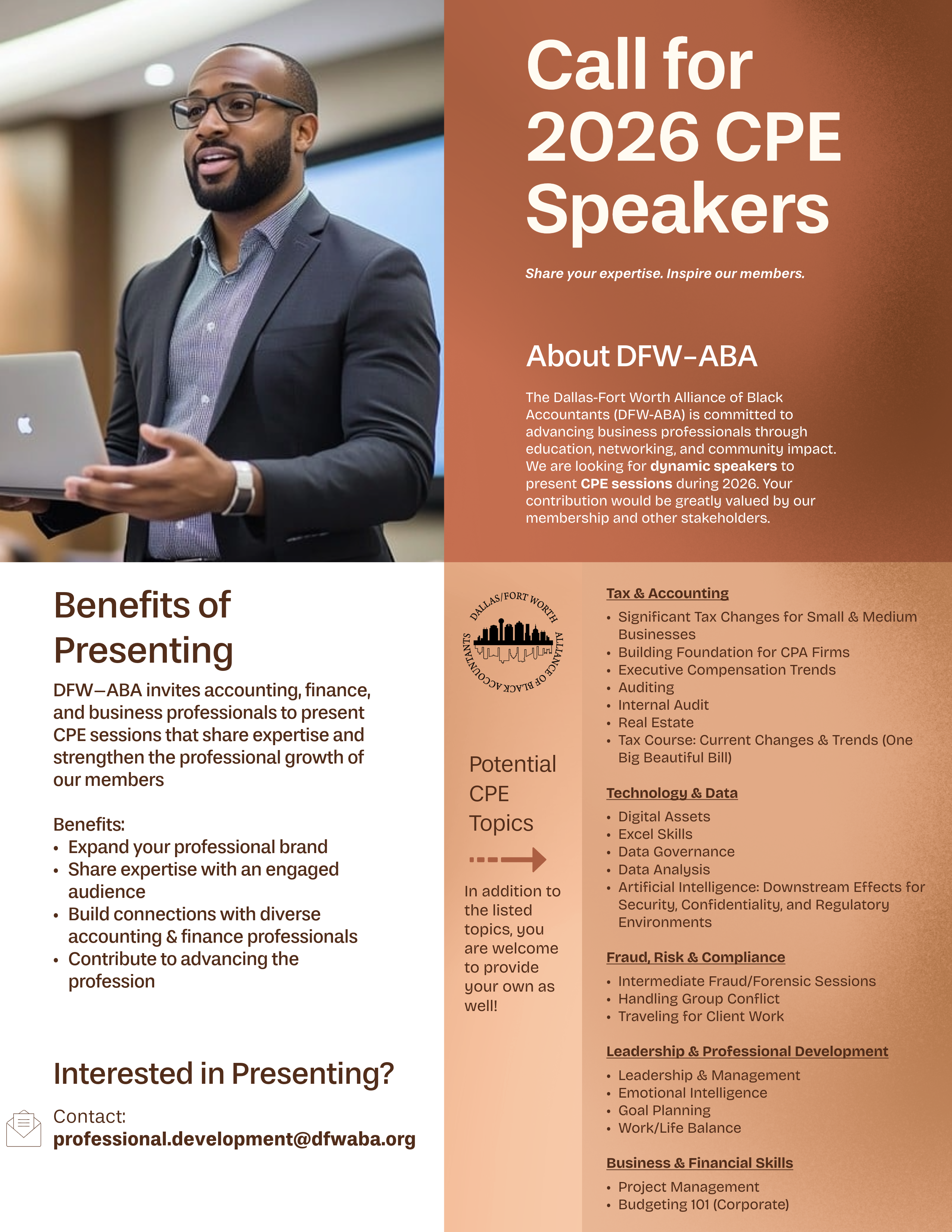 | | Call for 2026 CPE Speakers 📢 | | 📢 We’re looking for 2026 CPE Speakers! Do you have expertise in accounting, finance, technology, leadership, or business strategy? Share your knowledge and inspire professionals across the DFW community. Presenting a session helps expand your brand, connect with diverse peers, and advance the profession. Potential topics range from tax updates and digital assets to leadership, project management, and fraud prevention. But you’re welcome to pitch your own too! |
