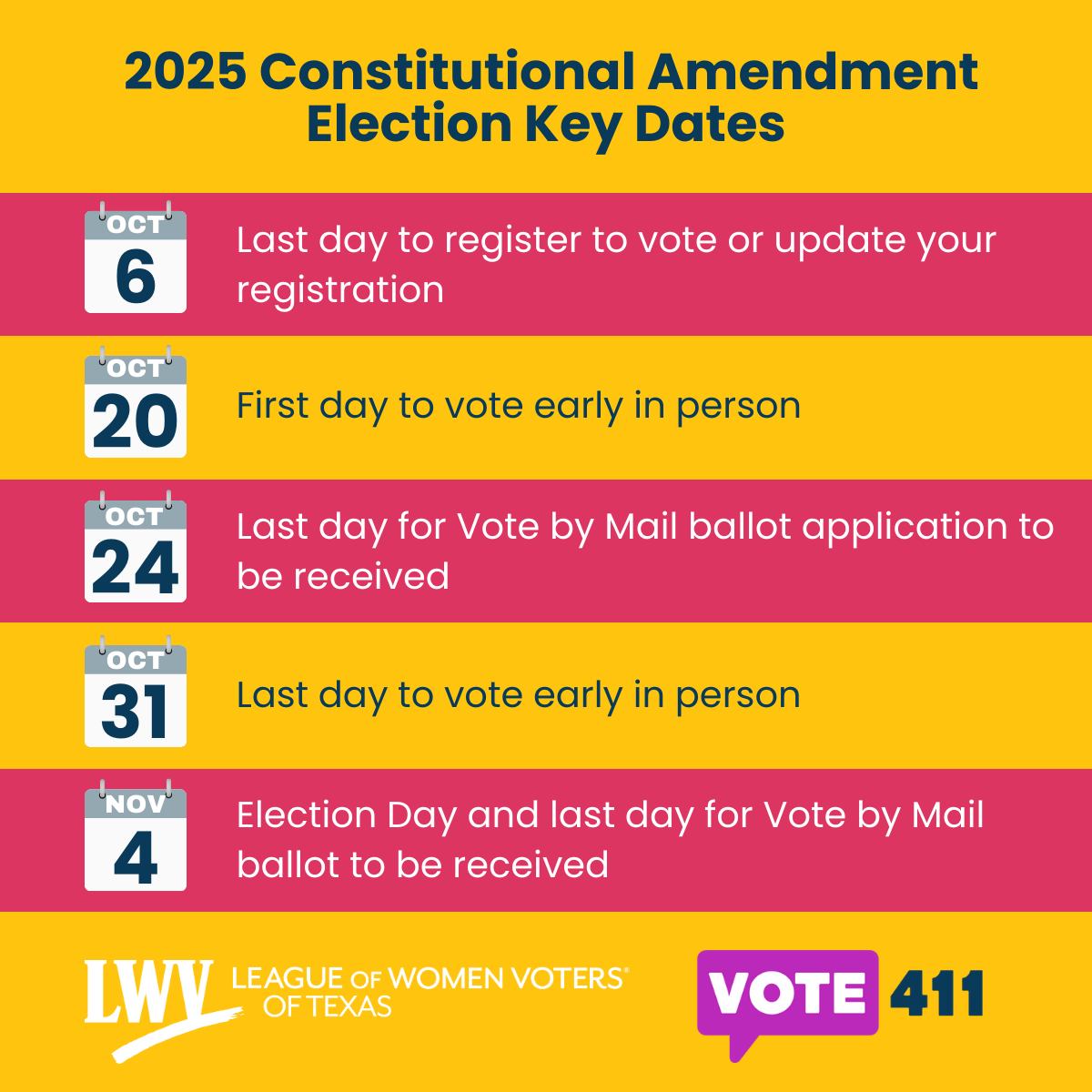 | Constitutional Joint Election 2025 | | There's a Constitutional Amendment Election coming up soon in Texas with 17 proposed amendments on the ballot! Here are all of the key dates you need to know: Oct. 6th - Last day to register to vote or update your registration Oct. 20th - First day to vote early in person Oct. 24th - Last day for Vote by Mail ballot application to be received Oct. 31st - Last day to vote early in person Nov. 4th - Election Day and last day for Vote by Mail ballot to be received