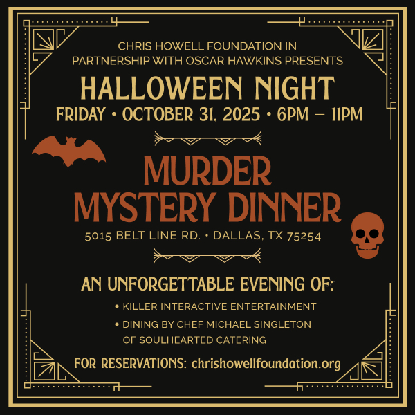 | Member Spotlight Event: Halloween Murder Mystery Dinner | | A Night of Mystery and Fun We love celebrating the incredible work of our members! The Chris Howell Foundation, in partnership with Dominique Howell, invites you to a night of mystery, intrigue and fun.